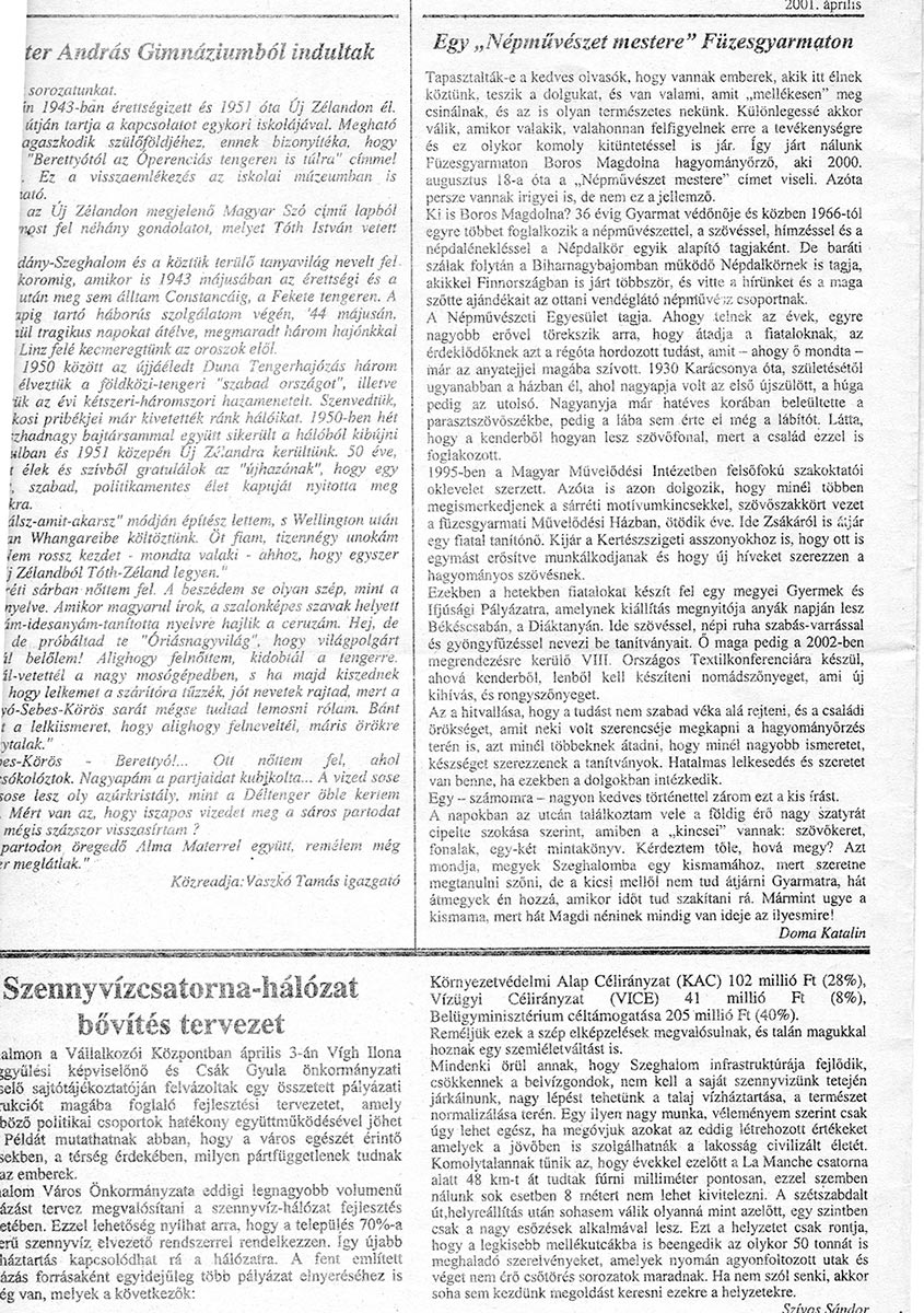 Tapasztalták-e a kedves olvasók, hogy vannak emberek, akik itt élnek köztünk, teszik a dolgukat, és van valami, amit “mellékesen” megcsinálnak, és a is olyan természetes nekünk. Különlegessé akkor válik, amikor valakik, valahonnan felfigyelnek erre a tevékenységre, és ez olykor komoly kitüntetéssel is jár. Így járt nálunk Füzesgyarmaton Boross Magdolna hagyományőrző, aki 2000. augusztus 18-a óta a “Népművészet mestere” címet viseli. Azóta persze vannak irigyei is, de nem ez a jellemző.